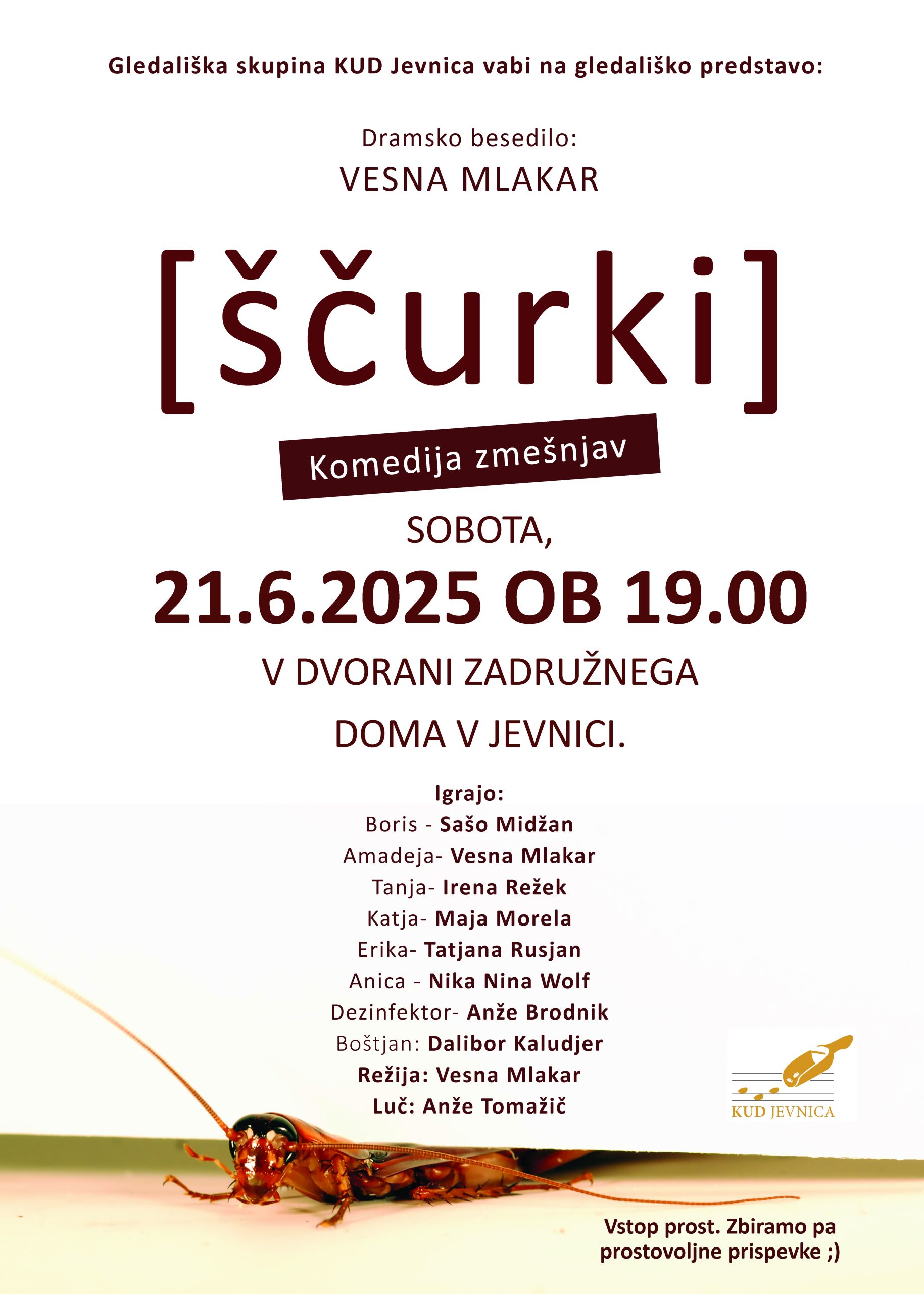 Domača gledališka skupina KUD Jevnica vas vabi na gledališko predstavo – komedijo zmešnjav ŠČURKI, ki bo v soboto, 21. 6. 20205 ob 19.00 uri v dvorani Zadružnega doma v Jevnici.